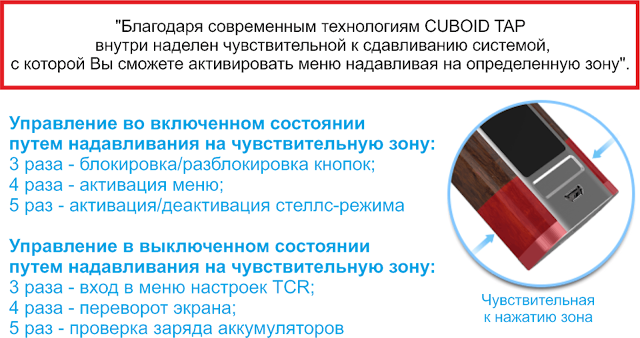 "Представляем Вашему вниманию Cuboid TAP - мод, с использованием технологии "TAPTEC" от Joyetech. Мы подошли к вопросу создания креативно и разработали кнопки, обладающие системой чувствительности к надавливанию и виброотдачей. Устройство работает, подпитываясь от двух аккумуляторов типа 18650, которые могут выдавать мощность в 228 Ватт. Также, в связке идет атомайзер ProCore Aries с инновационной системой верхней заправки в виде откидной крышки, способствующий мега-быстрой заправке. На Ваш выбор - сменные испарители типа ProC, которые отправляют пар прямо в легкие и воспроизводят огромное количество пара и сбалансированного вкуса. Прошивка Cuboid TAP - обновляемая; есть функция быстрой зарядки 2 Амперами. Дисплей - 1,3 дюйма, с возможностью кастомизации и установки часов и логотипа. Присутствует функция преднагрева и реверсивной зарядки. Помимо этого, с новыми кнопками, Cuboid Tap заставит Вас переосмыслить процесс парения и преподнесет его совершенно в новом свете"
