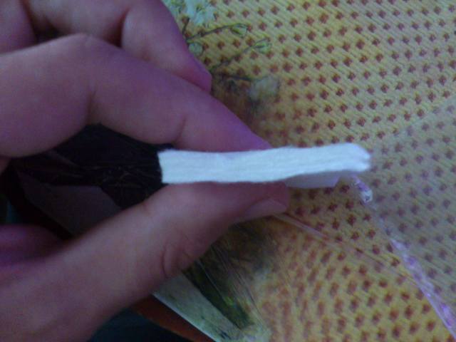 ну так надо как - отрезаете от нее кусок, примерно в два раза больше чем диаметр оправы спирали, снимаете с нее с одной-двух сторон тонкий пластик, чтоб пушок был снаружи, скатываете конец между пальцами в трубочку и запихиваете. должна идти туго, но проходить. если свободно гуляет - мало. если почти не идет - много. то что она тонкая - значения не имеет, вы ж ее в колбаску скатываете)